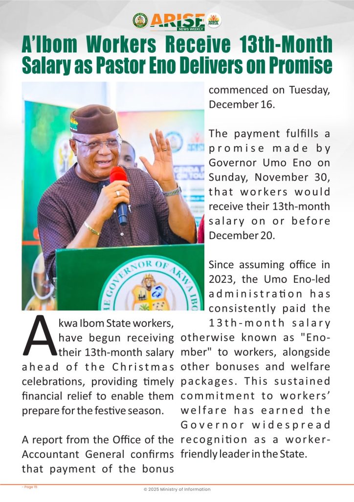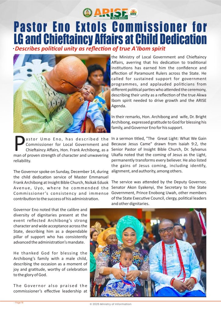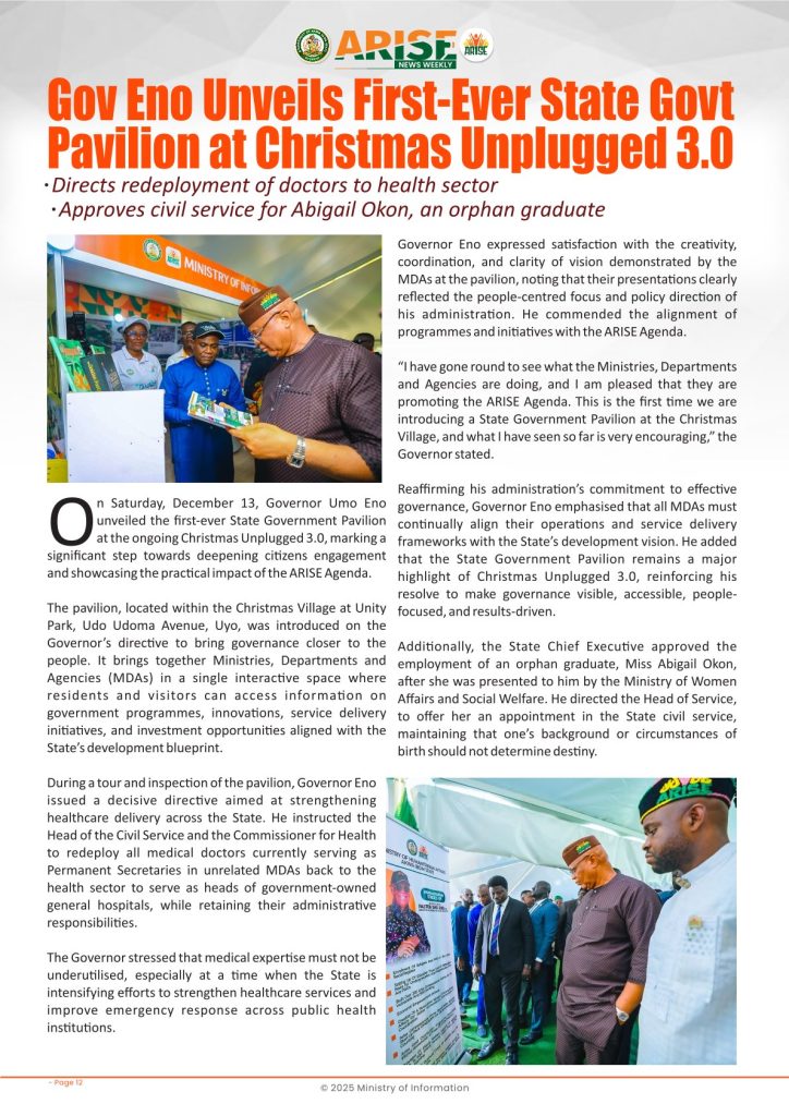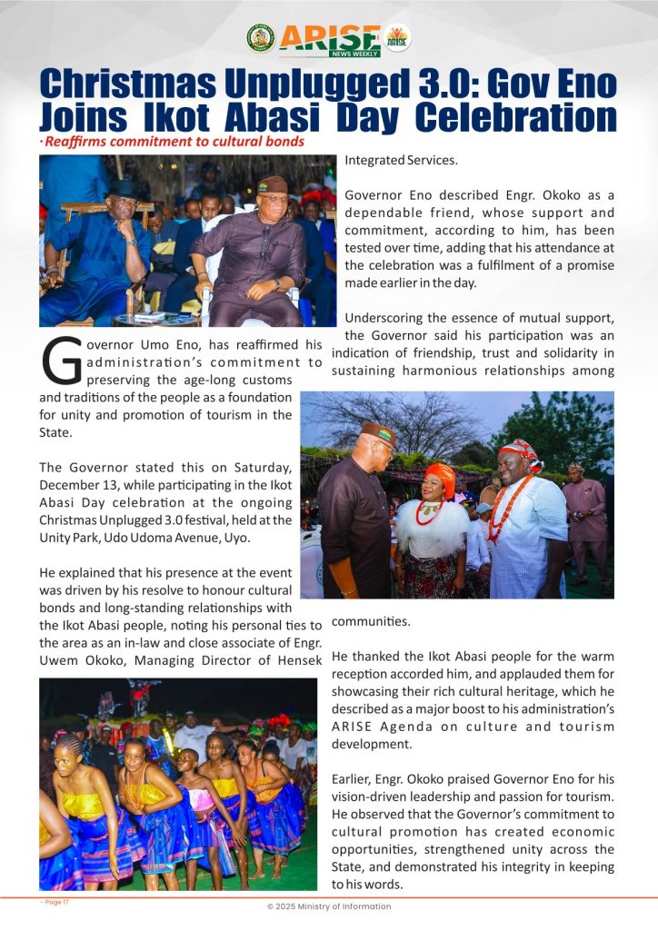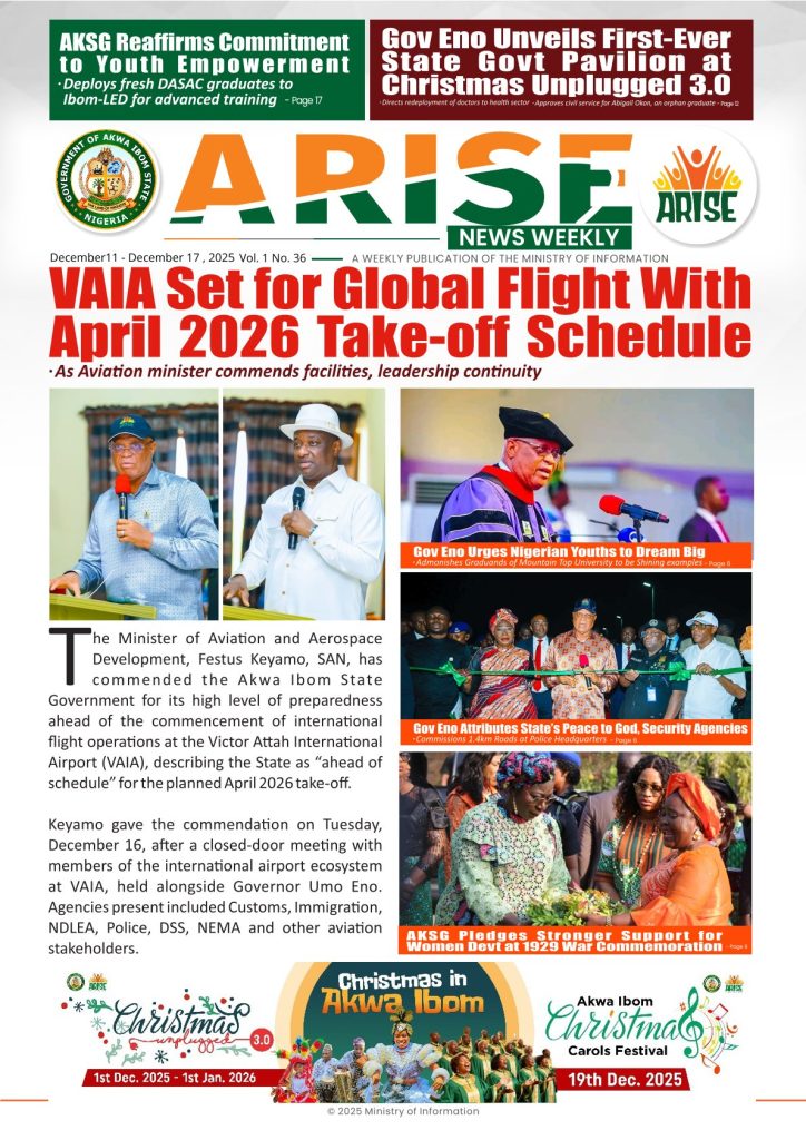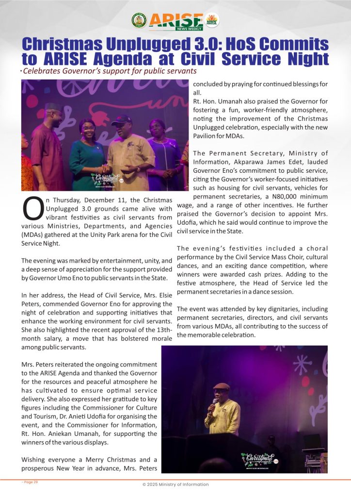 Ministry of InformationWeekly Magazine ARISE News Weekly December 11 – December 17 , 2025 Vol. 1 No. 36 By: Editor Date: December 19, 2025 ARISE NEWS WEEKLY December 8, 2025 VOL_35-10Download Previous articleARISE News Weekly December 4 – December 10, 2025 V o l . 1 No. 35Next articleARISE News Weekly December 18 – December 25, 2025 Vol. 1 No. 37 Editorhttp://blog.akwaibomstate.gov.ng LEAVE A REPLY Cancel reply Comment: Please enter your comment! Name:* Please enter your name here Email:* You have entered an incorrect email address! Please enter your email address here Website: Save my name, email, and website in this browser for the next time I comment. Yes, add me to your mailing list Share post: FacebookTwitterPinterestWhatsApp SubscribeI want inI've read and accept the Privacy Policy. Popular ARISE News Weekly – December 25 – December 31, 2025 Vol. 1 No. 38 ARISE News Weekly December 18 – December 25, 2025 Vol. 1 No. 37 ARISE News Weekly December 4 – December 10, 2025 V o l . 1 No. 35 ARISE News Weekly November 27 – December 3, 2025 V o l . 1 No. 34 Umanah Commends First Lady’s Office for Advancing Rural Devt Through Water Project in Abak More like thisRelated ARISE News Weekly – December 25 – December 31, 2025 Vol. 1 No. 38 Editor - December 31, 2025 ARISE NEWS WEEKLY DECEMBER 30, 2025 VOL_38-1Download ARISE News Weekly December 18 – December 25, 2025 Vol. 1 No. 37 Editor - December 26, 2025 ARISE NEWS WEEKLY DECEMBER 24, 2025 VOL_37Download ARISE News Weekly December 4 – December 10, 2025 V o l . 1 No. 35 Editor - December 11, 2025 ARISE NEWS WEEKLY December 8, 2025 VOL_35Download ARISE News Weekly November 27 – December 3, 2025 V o l . 1 No. 34 Editor - December 3, 2025