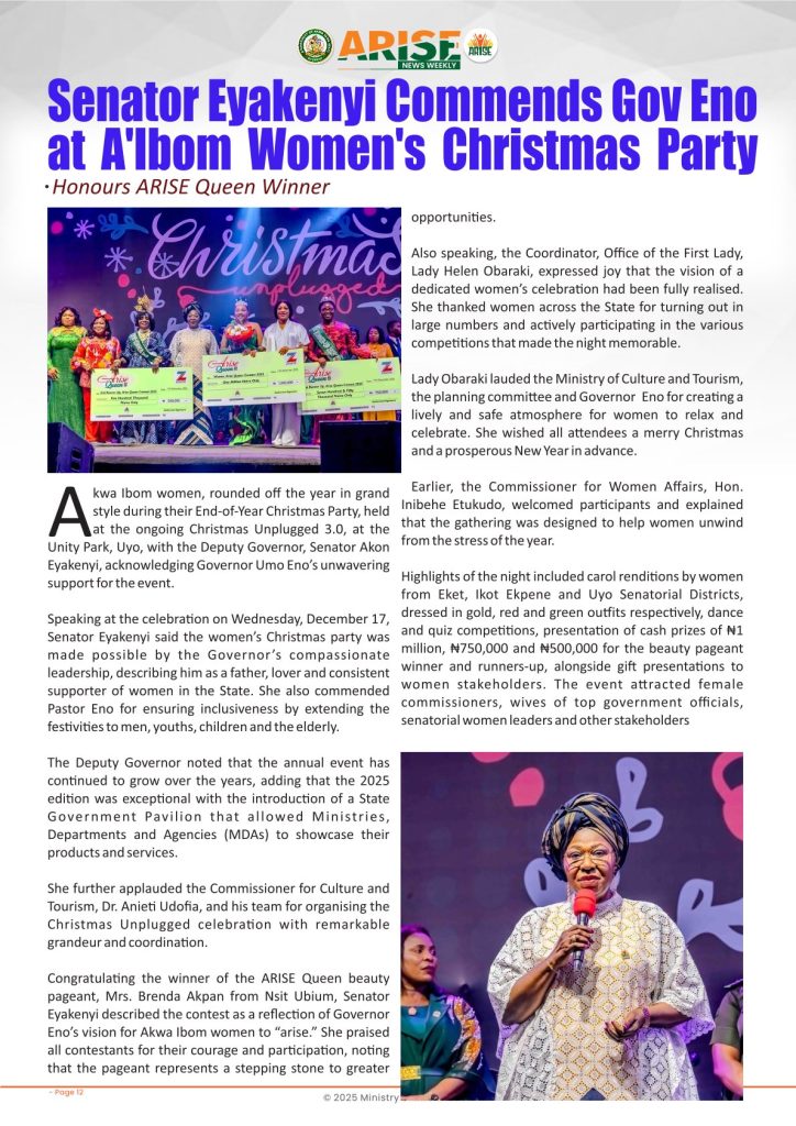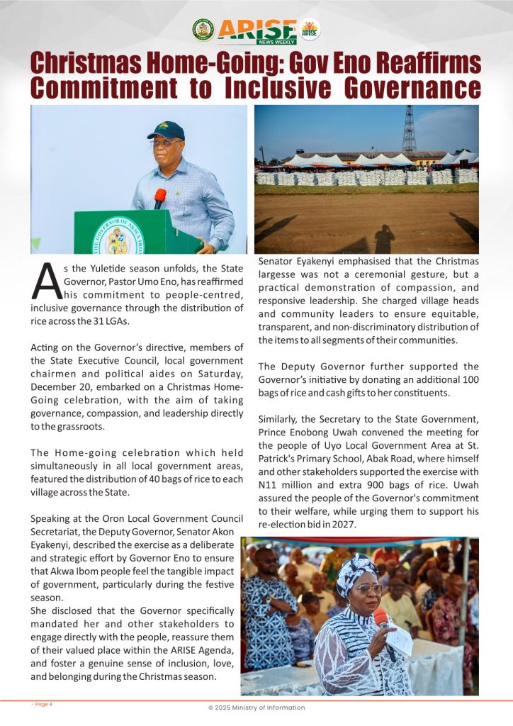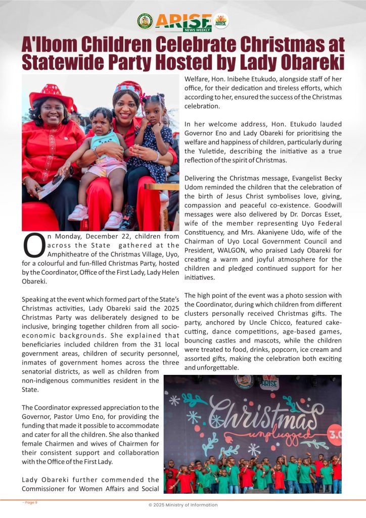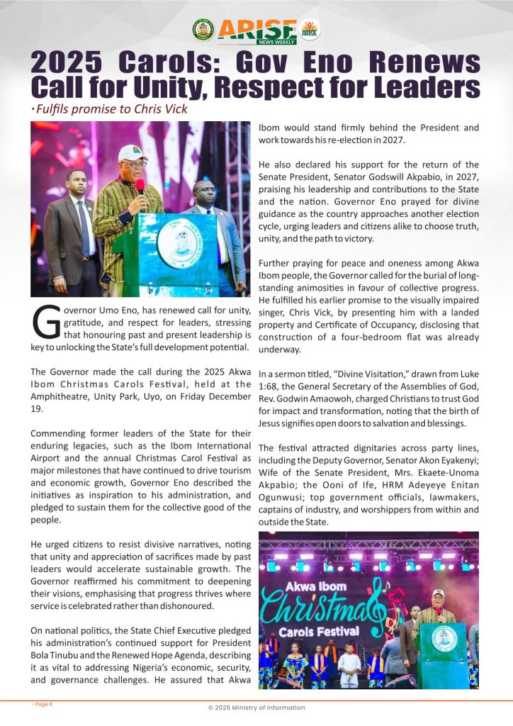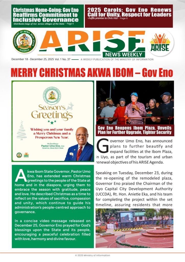 Ministry of InformationWeekly Magazine ARISE News Weekly December 18 – December 25, 2025 Vol. 1 No. 37 By: Editor Date: December 26, 2025 ARISE NEWS WEEKLY DECEMBER 24, 2025 VOL_37Download Previous articleARISE News Weekly December 11 – December 17 , 2025 Vol. 1 No. 36Next articleARISE News Weekly – December 25 – December 31, 2025 Vol. 1 No. 38 Editorhttp://blog.akwaibomstate.gov.ng LEAVE A REPLY Cancel reply Comment: Please enter your comment! Name:* Please enter your name here Email:* You have entered an incorrect email address! Please enter your email address here Website: Save my name, email, and website in this browser for the next time I comment. Yes, add me to your mailing list Share post: FacebookTwitterPinterestWhatsApp SubscribeI want inI've read and accept the Privacy Policy. Popular ARISE News Weekly – December 25 – December 31, 2025 Vol. 1 No. 38 ARISE News Weekly December 11 – December 17 , 2025 Vol. 1 No. 36 ARISE News Weekly December 4 – December 10, 2025 V o l . 1 No. 35 ARISE News Weekly November 27 – December 3, 2025 V o l . 1 No. 34 Umanah Commends First Lady’s Office for Advancing Rural Devt Through Water Project in Abak More like thisRelated ARISE News Weekly – December 25 – December 31, 2025 Vol. 1 No. 38 Editor - December 31, 2025 ARISE NEWS WEEKLY DECEMBER 30, 2025 VOL_38-1Download ARISE News Weekly December 11 – December 17 , 2025 Vol. 1 No. 36 Editor - December 19, 2025 ARISE NEWS WEEKLY December 8, 2025 VOL_35-10Download ARISE News Weekly December 4 – December 10, 2025 V o l . 1 No. 35 Editor - December 11, 2025 ARISE NEWS WEEKLY December 8, 2025 VOL_35Download ARISE News Weekly November 27 – December 3, 2025 V o l . 1 No. 34 Editor - December 3, 2025