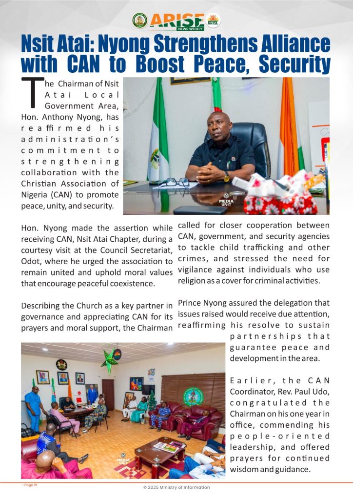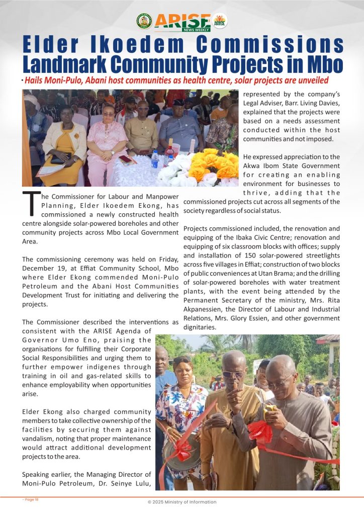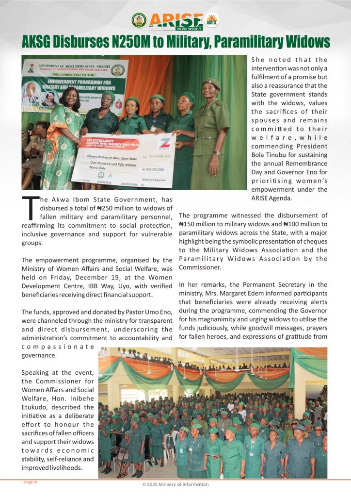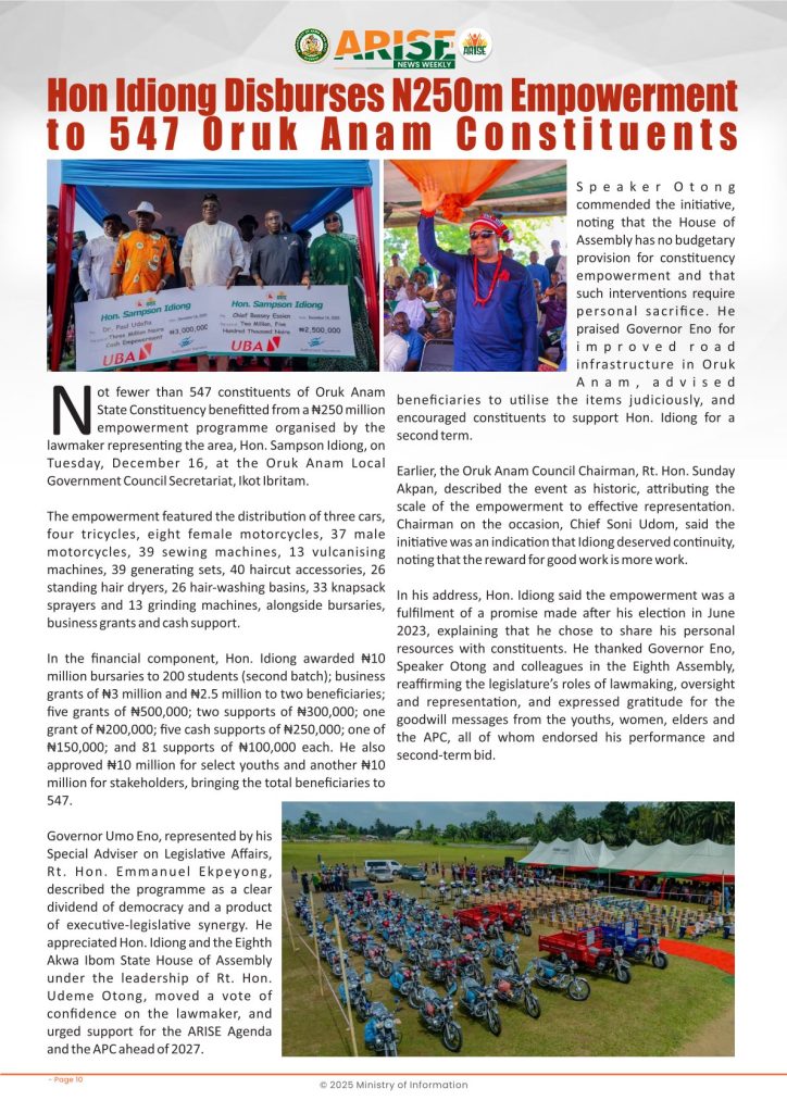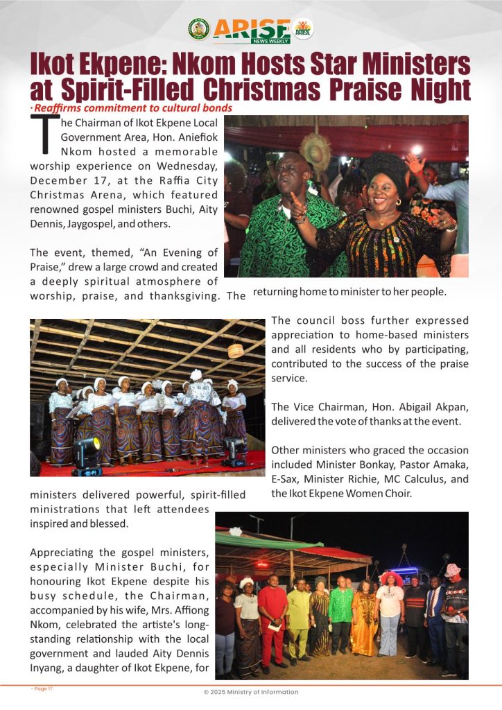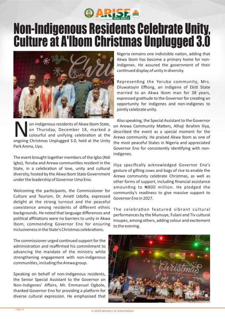 Ministry of InformationWeekly Magazine ARISE News Weekly December 18 – December 25, 2025 Vol. 1 No. 37 By: Editor Date: December 26, 2025 ARISE NEWS WEEKLY DECEMBER 24, 2025 VOL_37Download Previous articleARISE News Weekly December 11 – December 17 , 2025 Vol. 1 No. 36Next articleARISE News Weekly – December 25 – December 31, 2025 Vol. 1 No. 38 Editorhttp://blog.akwaibomstate.gov.ng LEAVE A REPLY Cancel reply Comment: Please enter your comment! Name:* Please enter your name here Email:* You have entered an incorrect email address! Please enter your email address here Website: Save my name, email, and website in this browser for the next time I comment. Yes, add me to your mailing list Share post: FacebookTwitterPinterestWhatsApp SubscribeI want inI've read and accept the Privacy Policy. Popular ARISE News Weekly – December 25 – December 31, 2025 Vol. 1 No. 38 ARISE News Weekly December 11 – December 17 , 2025 Vol. 1 No. 36 ARISE News Weekly December 4 – December 10, 2025 V o l . 1 No. 35 ARISE News Weekly November 27 – December 3, 2025 V o l . 1 No. 34 Umanah Commends First Lady’s Office for Advancing Rural Devt Through Water Project in Abak More like thisRelated ARISE News Weekly – December 25 – December 31, 2025 Vol. 1 No. 38 Editor - December 31, 2025 ARISE NEWS WEEKLY DECEMBER 30, 2025 VOL_38-1Download ARISE News Weekly December 11 – December 17 , 2025 Vol. 1 No. 36 Editor - December 19, 2025 ARISE NEWS WEEKLY December 8, 2025 VOL_35-10Download ARISE News Weekly December 4 – December 10, 2025 V o l . 1 No. 35 Editor - December 11, 2025 ARISE NEWS WEEKLY December 8, 2025 VOL_35Download ARISE News Weekly November 27 – December 3, 2025 V o l . 1 No. 34 Editor - December 3, 2025