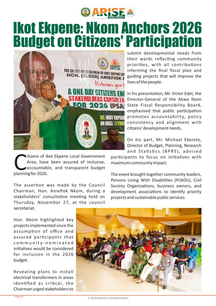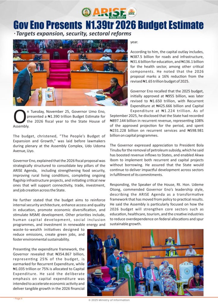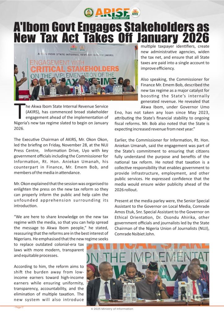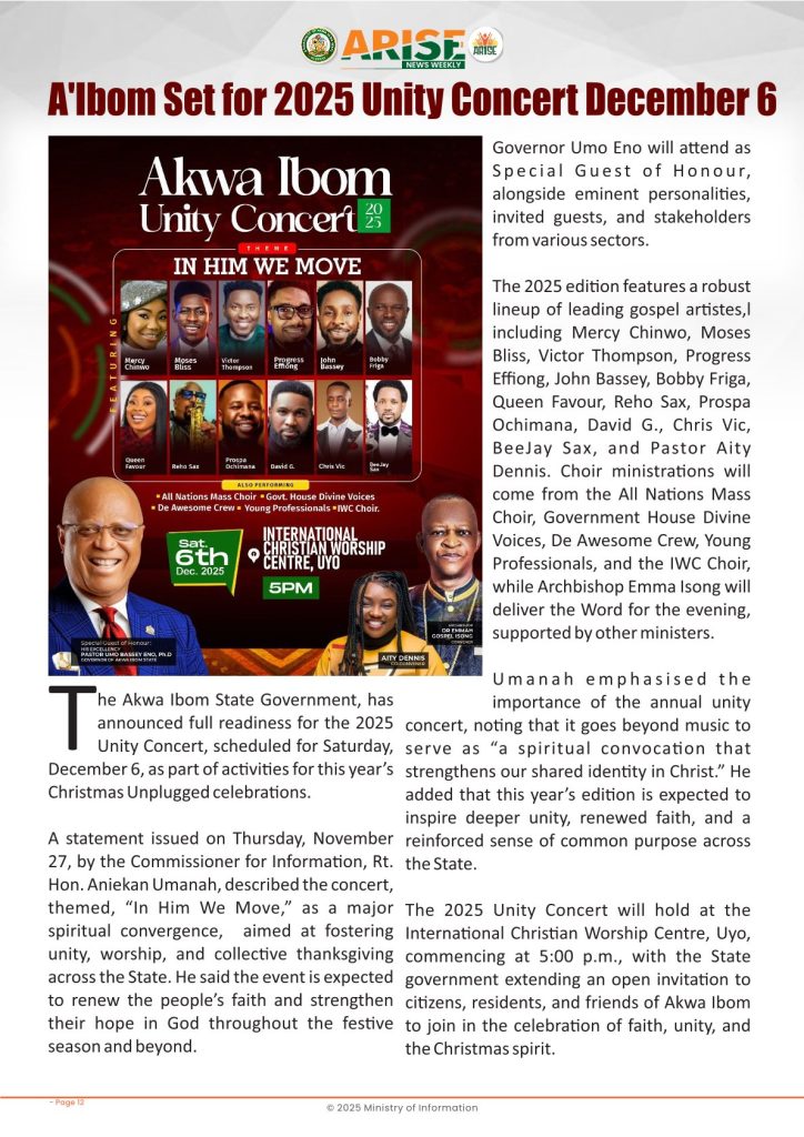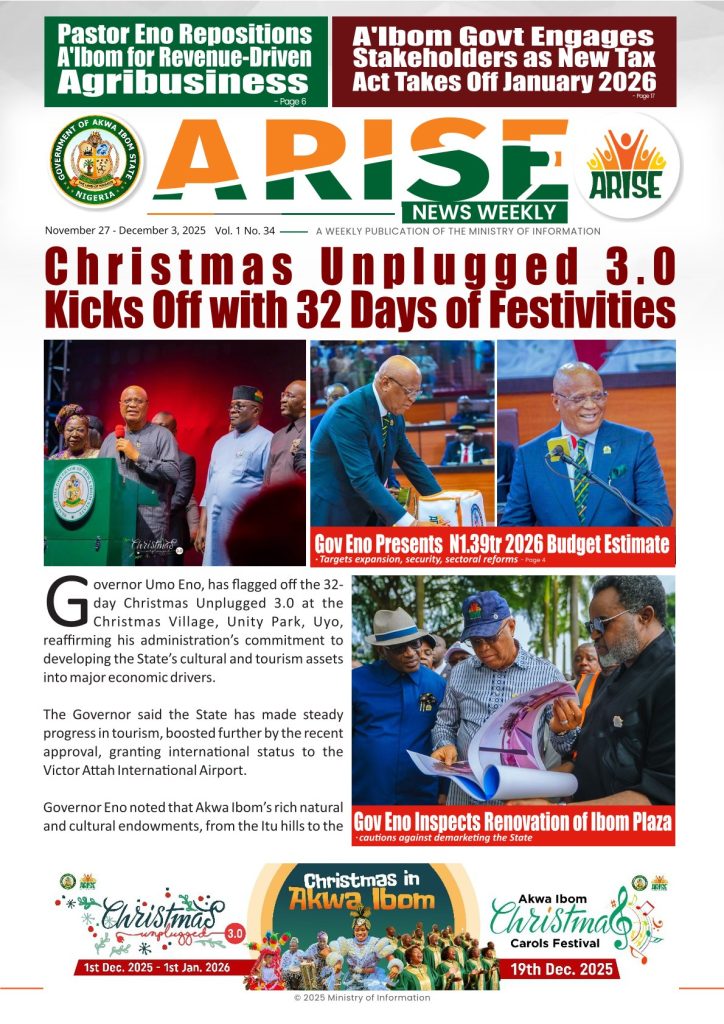 Ministry of InformationWeekly Magazine ARISE News Weekly November 27 – December 3, 2025 V o l . 1 No. 34 By: Editor Date: December 3, 2025 Previous articleUmanah Commends First Lady’s Office for Advancing Rural Devt Through Water Project in AbakNext articleARISE News Weekly December 4 – December 10, 2025 V o l . 1 No. 35 Editorhttp://blog.akwaibomstate.gov.ng LEAVE A REPLY Cancel reply Comment: Please enter your comment! Name:* Please enter your name here Email:* You have entered an incorrect email address! Please enter your email address here Website: Save my name, email, and website in this browser for the next time I comment. Yes, add me to your mailing list Share post: FacebookTwitterPinterestWhatsApp SubscribeI want inI've read and accept the Privacy Policy. Popular ARISE News Weekly – December 25 – December 31, 2025 Vol. 1 No. 38 ARISE News Weekly December 18 – December 25, 2025 Vol. 1 No. 37 ARISE News Weekly December 11 – December 17 , 2025 Vol. 1 No. 36 ARISE News Weekly December 4 – December 10, 2025 V o l . 1 No. 35 Umanah Commends First Lady’s Office for Advancing Rural Devt Through Water Project in Abak More like thisRelated ARISE News Weekly – December 25 – December 31, 2025 Vol. 1 No. 38 Editor - December 31, 2025 ARISE NEWS WEEKLY DECEMBER 30, 2025 VOL_38-1Download ARISE News Weekly December 18 – December 25, 2025 Vol. 1 No. 37 Editor - December 26, 2025 ARISE NEWS WEEKLY DECEMBER 24, 2025 VOL_37Download ARISE News Weekly December 11 – December 17 , 2025 Vol. 1 No. 36 Editor - December 19, 2025 ARISE NEWS WEEKLY December 8, 2025 VOL_35-10Download ARISE News Weekly December 4 – December 10, 2025 V o l . 1 No. 35 Editor - December 11, 2025 ARISE NEWS WEEKLY December 8, 2025 VOL_35Download